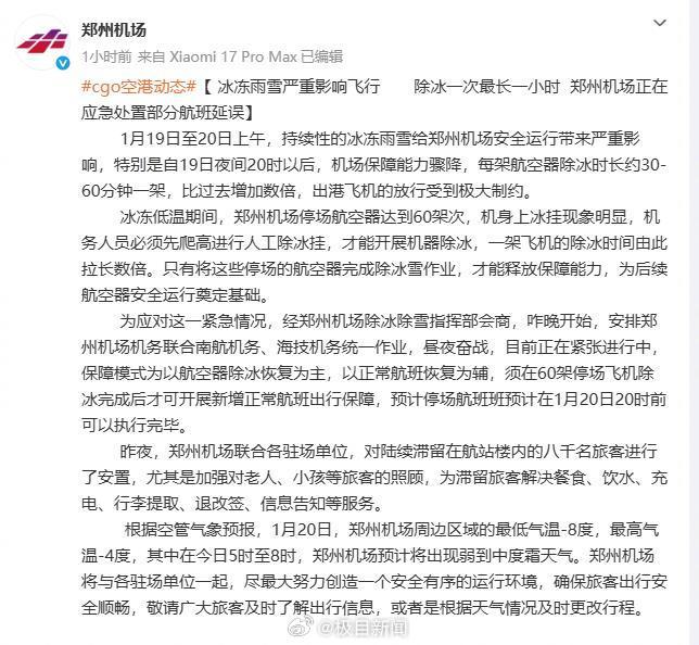 该消息称,机场需在60架停场飞机除冰完成后才可开展新增正常航班出行保障,预计停场航班在1月20日20时前执行完毕。